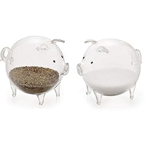Decorative pig glass salt and pepper shaker set with holder stand in farm animal figurines, sculptures & statues or rustic country kitchen decor and restaurant table spice rack decorations as gifts for farmers.